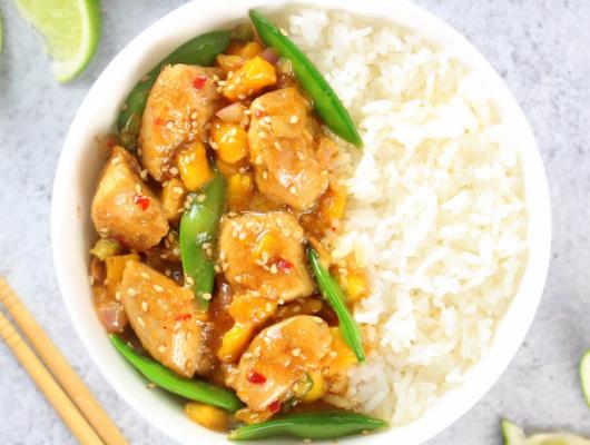 Source : http://foodista.com/recipe/2X62JJMT/mango-chicken-stir-fry-with-snap-peas